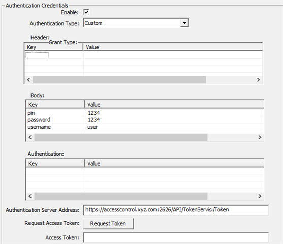 https://accesscontrol.xyz.com:2626/API/TokenServisi/Token Method: POST Request Body: { "username": "string", "password": "string", "pin": 0 } |