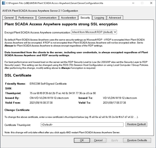 Updating SSL certificate is straightforward. Launch Plant SCADA Access Anywhere from Start Menu and go to Security Tab as shown below. Simply place the thumbprint of your own certificate and then click on Apply button. You need to restart the service from General tab.