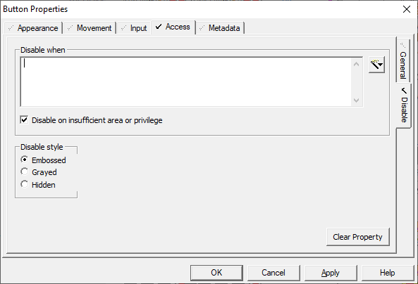 • If you want the button to disappear, you have to go to the Access tab on the top, then the Disable tab on the right, and select "Disable on insufficient area or privilege". Then select the Disable Style.