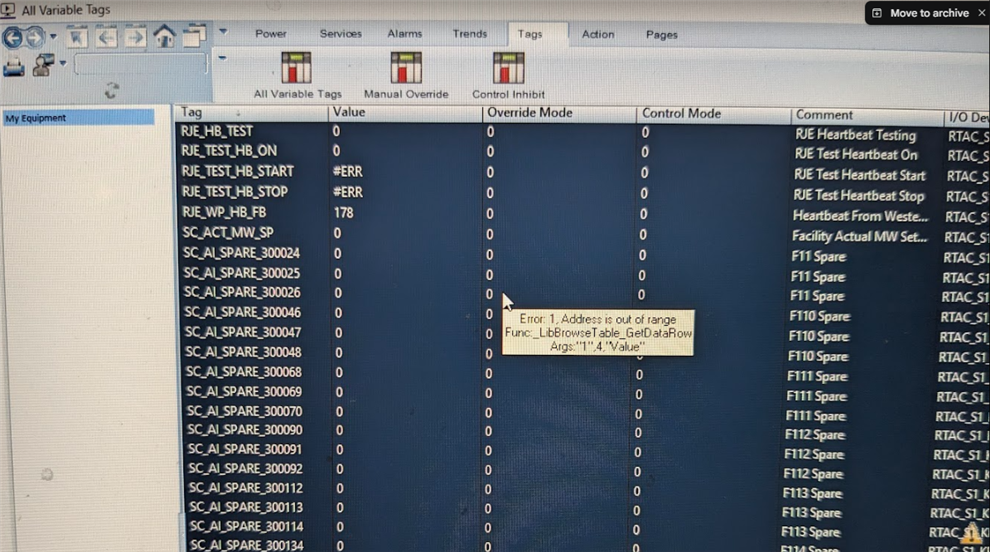 Hi All. In Plant SCADA 2023 I am experiencing an issue whereby when I select Tags->All Variable Tags and the list of tags appears there is also an exclamation mark in the background and an error message "Error 1, Address is out of range Func:_LibBrowseTable_GetDataRowArgs:"1",4,'Value". Has anyone seen something similar to this?
