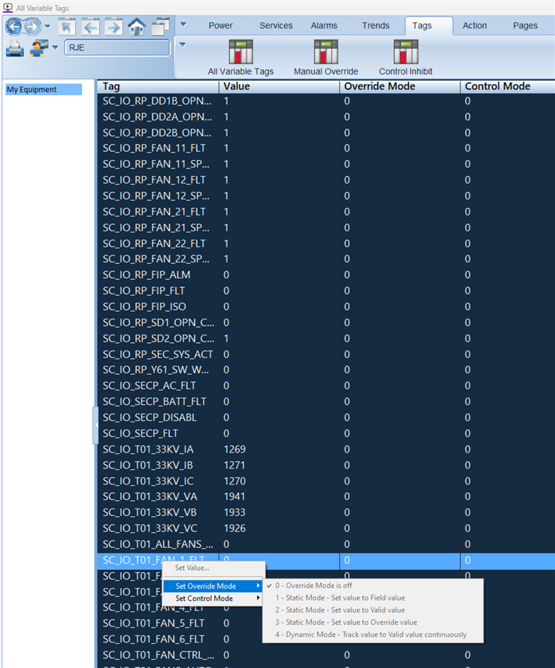 Hi All, Relatively new to Plant SCADA. I am trying to force/override values in Plant SCADA via the Tags-All Variable Tags screen below so I can test an OPC UA client reading those tags. The Set Override Mode fields are all greyed out. Is there somewhere to enable overrides in the system as a whole? Could this be a user permissions issue? I believe the user configured has the highest privileges.