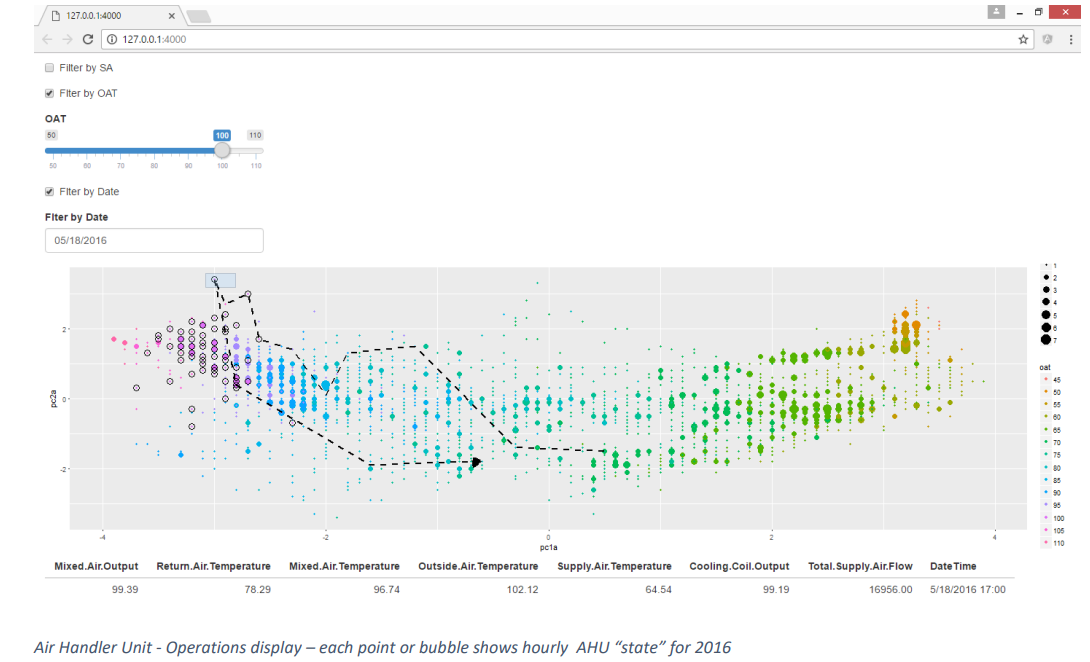 - Using the PCA model with Shiny https://shiny.rstudio.com/ to create an interactive display for visualizing and exploring faults vs. normal operation; also using SVM (support vector machine) for classification and prediction of Air Handler (AHU) fault/no-fault state