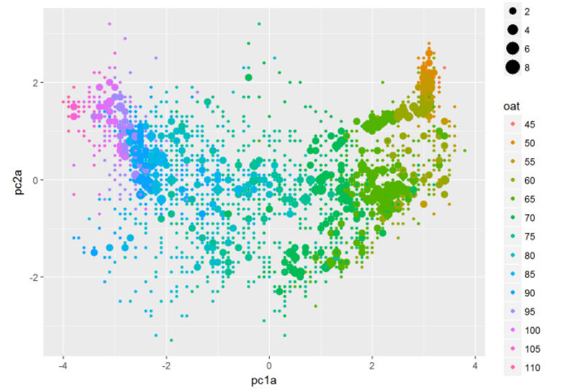 Figure shows the various AHU operatonal states; 'oat' is outside air temparature, the bubble size represents the count of overlaid data points