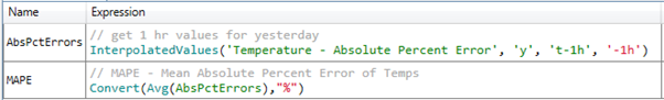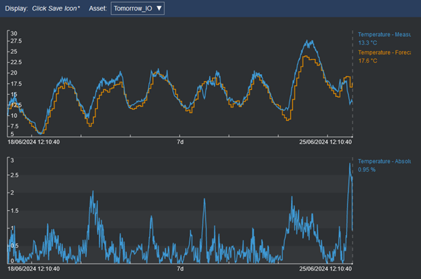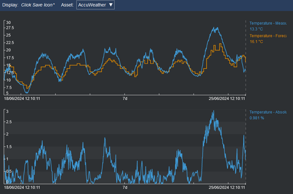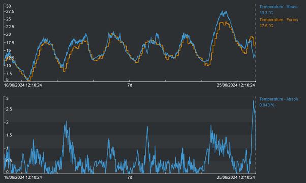 Using a Formula data reference: Absolute of Measured Temperature minus Forecast Temperature divided by Measured Temperature, expressed as a percentage: