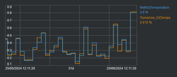 The trends show that MetNO and Tomorrow.io are very close but it is not obvious which is more accurate on average. Using the MAPE result to compare MetNO and Tomorrow.io shows that Tomorrow.io is probably marginally more accurate.