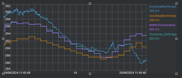 Here we hit upon our first problem that PI can easily solve. AccuWeather provides temperature data by default in Fahrenheit, whereas MetNO and Tomorrow.io provide the data by default in Celsius. The measured temperature from the weather station is also in Celsius.