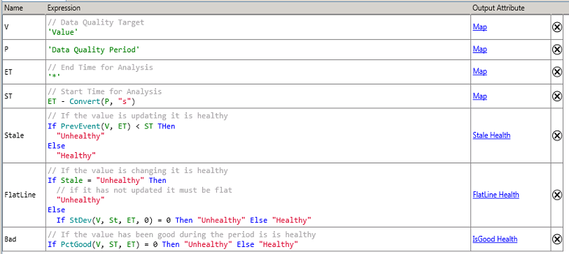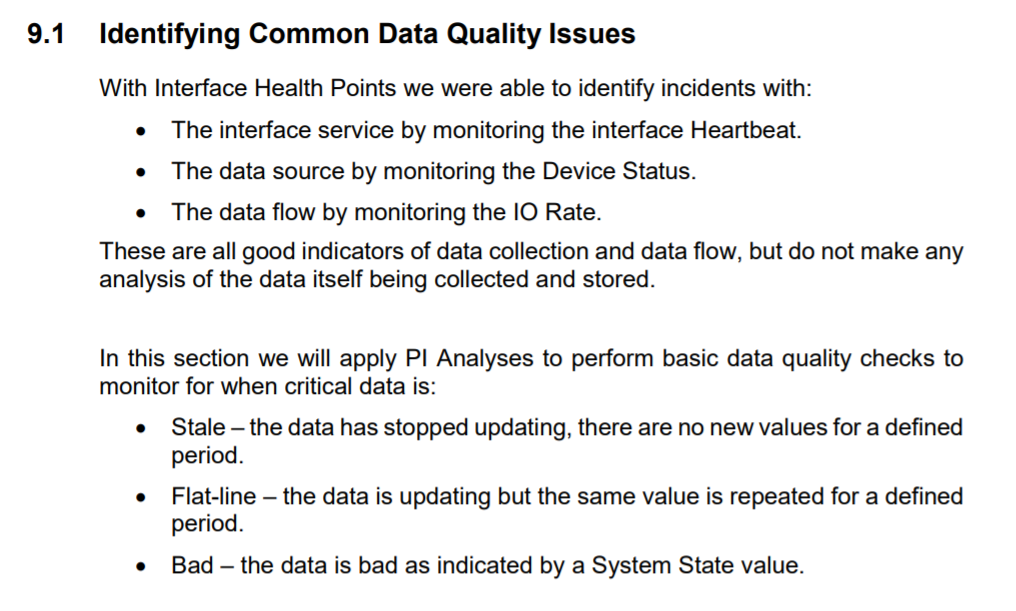 Sensor data quality issues (flat line, bad data, stale data...) that are beyond the logic in PI System Monitoring can still be trapped with simple analytics - see Chapter 9.