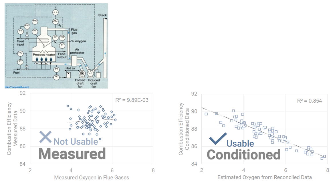 In another use case, a pre-heater example illustrates the need for a connected flow model. The stack flue gas O2 (oxygen) measurements are unusable until reconciled with mass/energy balance corrections.