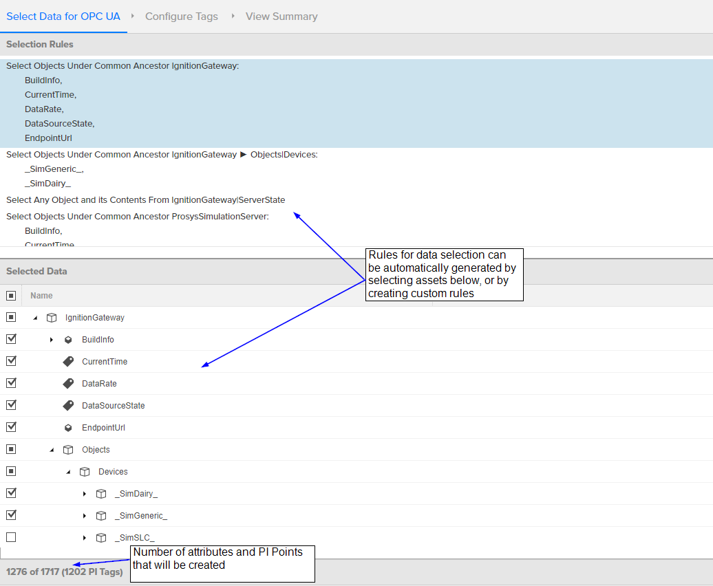 To perform the data selection, one can either manually create rules, or use the data selection UI to select what nodes should be brought in to PI as PI Point / AF objects.