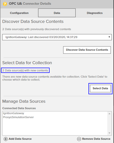 Once, the data source has been added, the first step is to perform data selection. In this example, we will connect to an Ignition SCADA Gateway OPC UA module.