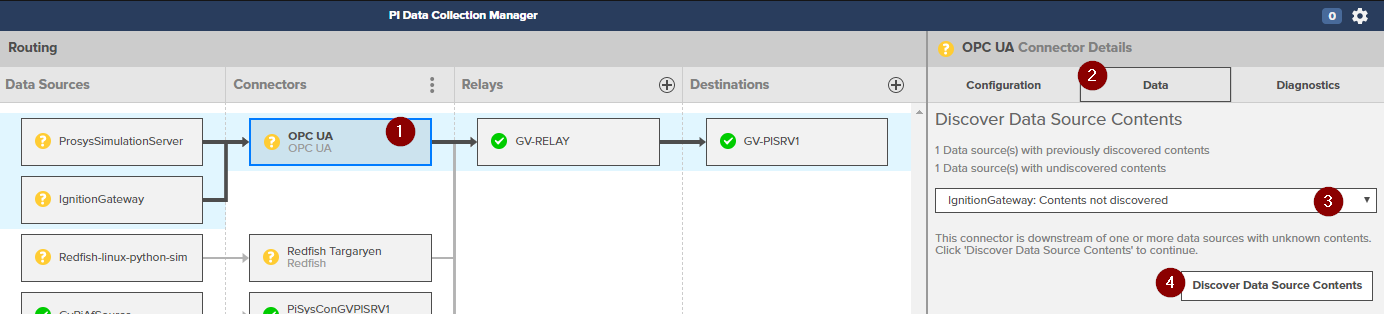 On the DCM, select the OPC UA Connector, then navigate to the Data tab, select the data source, and perform the data source content discovery.