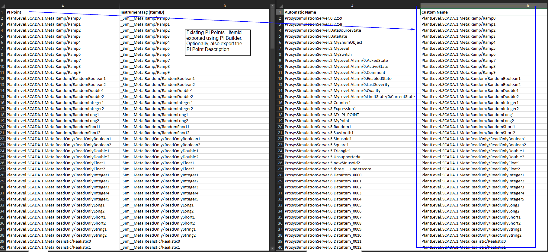 Open the exported spreadsheet and the PI Points with their instrumenttag, and use VLOOKUP to match the new OPC UA Points to their existing OPC DA PI Points (exported with PI Builder)