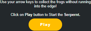 You begin as a snake that is 3 squares long. Move around the grid and eat the single stationary frog. When you eat a frog, the snake lengthens by 1 square and a new frog appears at a random place on the grid. The game is over if you run into yourself or the edge of the screen.