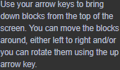 A random tetromino ("block") falls from the top of the screen towards the bottom. Move and rotate this block before it lands at the bottom of the screen or on top of parts of previous blocks. After the current block lands, a new random tetromino will spawn at the top of the screen. When the blocks form a complete horizontal line across the screen, that line is cleared. As you progress, the level increases, so the blocks fall faster. The game is over when a newly spawned block overlaps with any part of a previous block.