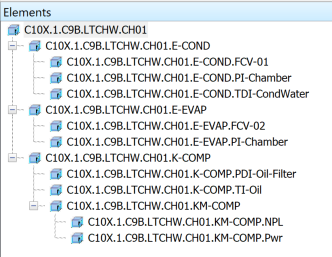 Shown Below is a Chiller model in PI for a lightly monitored unit typical in Facilities or Transportation. The PIDT model of Chillers encourages a composition of multiple assets that combine to form a chiller: heat exchangers, compressor(s), Motors, piping and valves. You assemble your chiller in PI using the PIDT libraries for BAS, HEX, CPR, MTR, VLV, PIP.